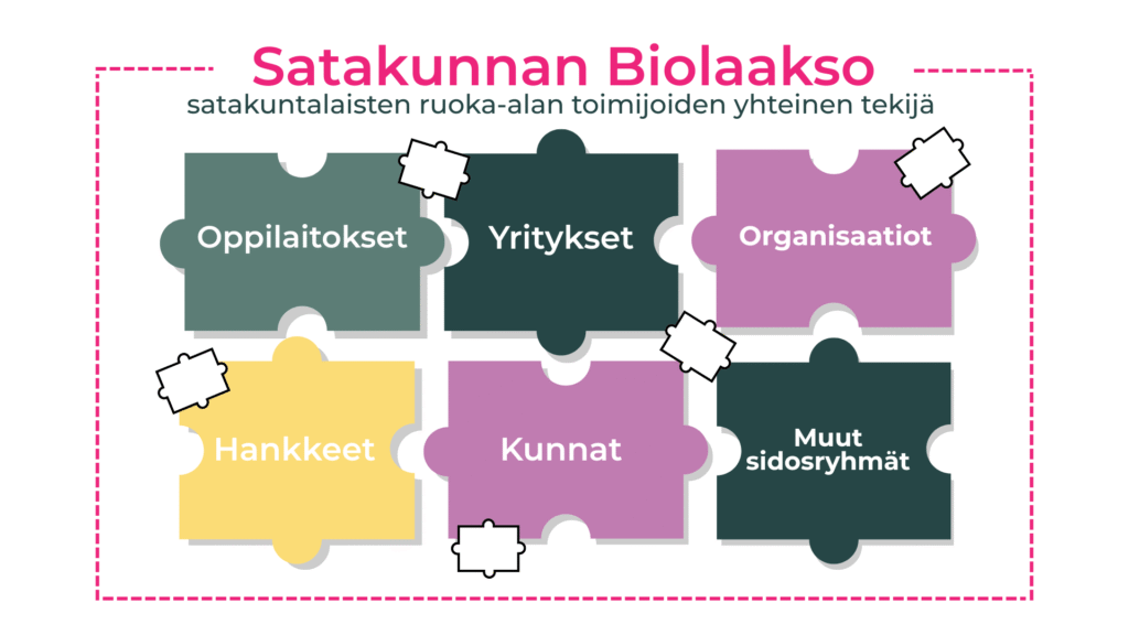 Ruoka-ala on laaja ja monialainen kokonaisuus, jonka sisällä kaikilla on oma roolinsa. Jokainen pala on yksinään merkityksellinen ja tärkeä osa suurempaa kokonaisuutta. Satakunnan Biolaakso kokoaa nämä palat yhteen. Kun mukaan saadaan erilaisia toimijoita, osaamista ja näkökulmia, satakuntalaisesta ruoka-alasta voidaan rakentaa entistä vahvempi ja kestävämpi. Mitä enemmän toimijoita mukana, sitä vaikuttavamman ja näkyvämmän kokonaisuuden saamme yhdessä pala palalta rakennettua.
